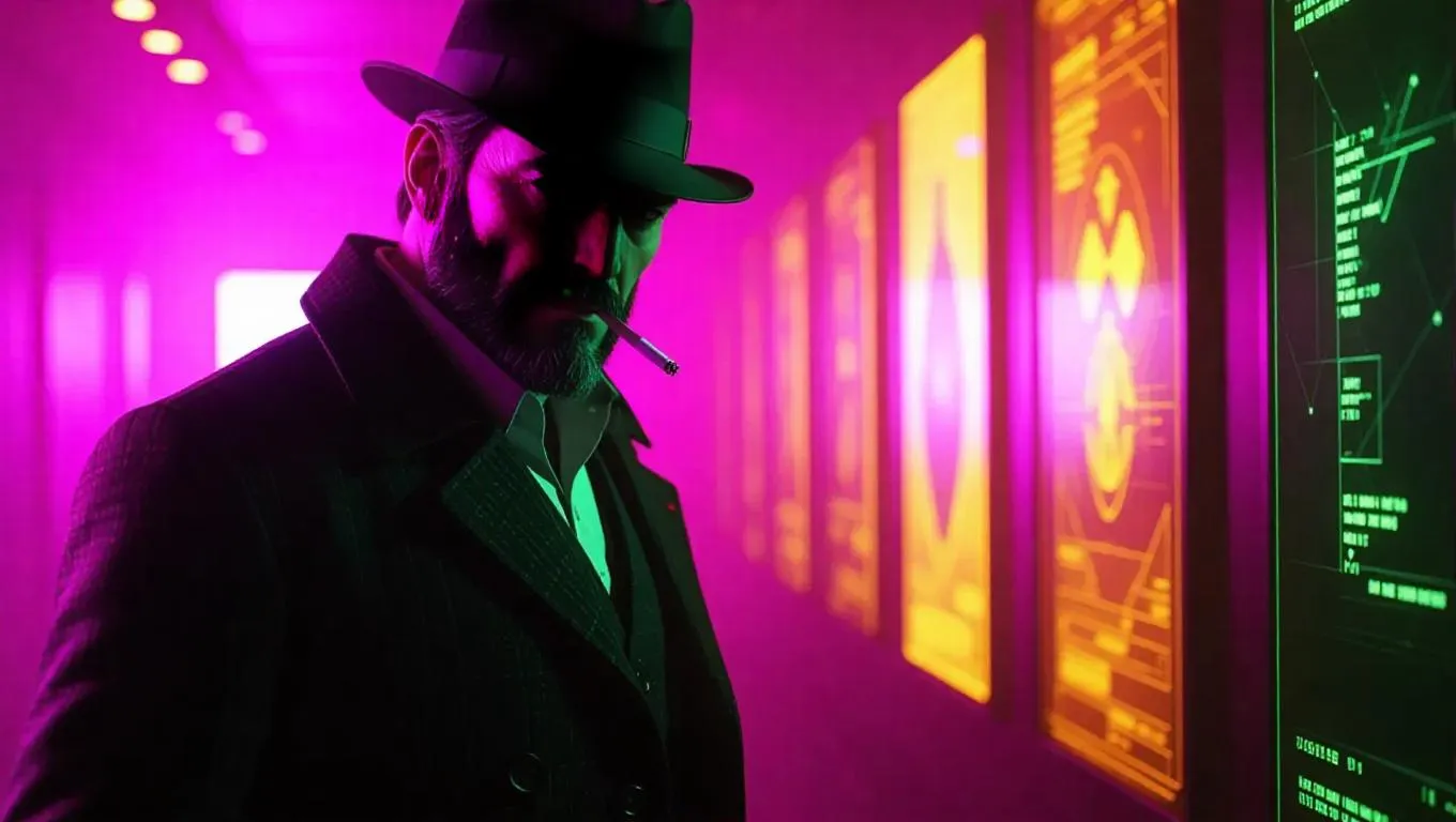 A rugged adult Detective Conan, with a scruffy beard and a cigarette, investigates an art theft ring in a dimly-lit, neon-glow gallery. High-tech clues float on holograms, casting a mysterious glow. The gallery's polished, modern design contrasts with Conan's worn, determined expression. Soft, cool green and yellow lights highlight the technology, while hard, warm shadows emphasize his intense focus and the drama of the scene. The style is a blend of noir and surrealism, capturing both the gritty realism and the dream-like qualities.