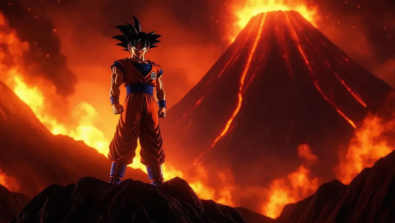 Goku, dressed in a sleek battle uniform, stands triumphantly on a rocky cliff facing a majestic volcano. His eyes are fierce, and his expression is determined, reflecting his readiness for battle. The volcano's flames create a dramatic, intense atmosphere, with fiery light illuminating the scene and casting bold shadows on the rocky surface. The light is bright and fiery, enhancing the relentless energy of the moment. The scene is rendered in a dynamic style, capturing the raw power and intensity of the environment.