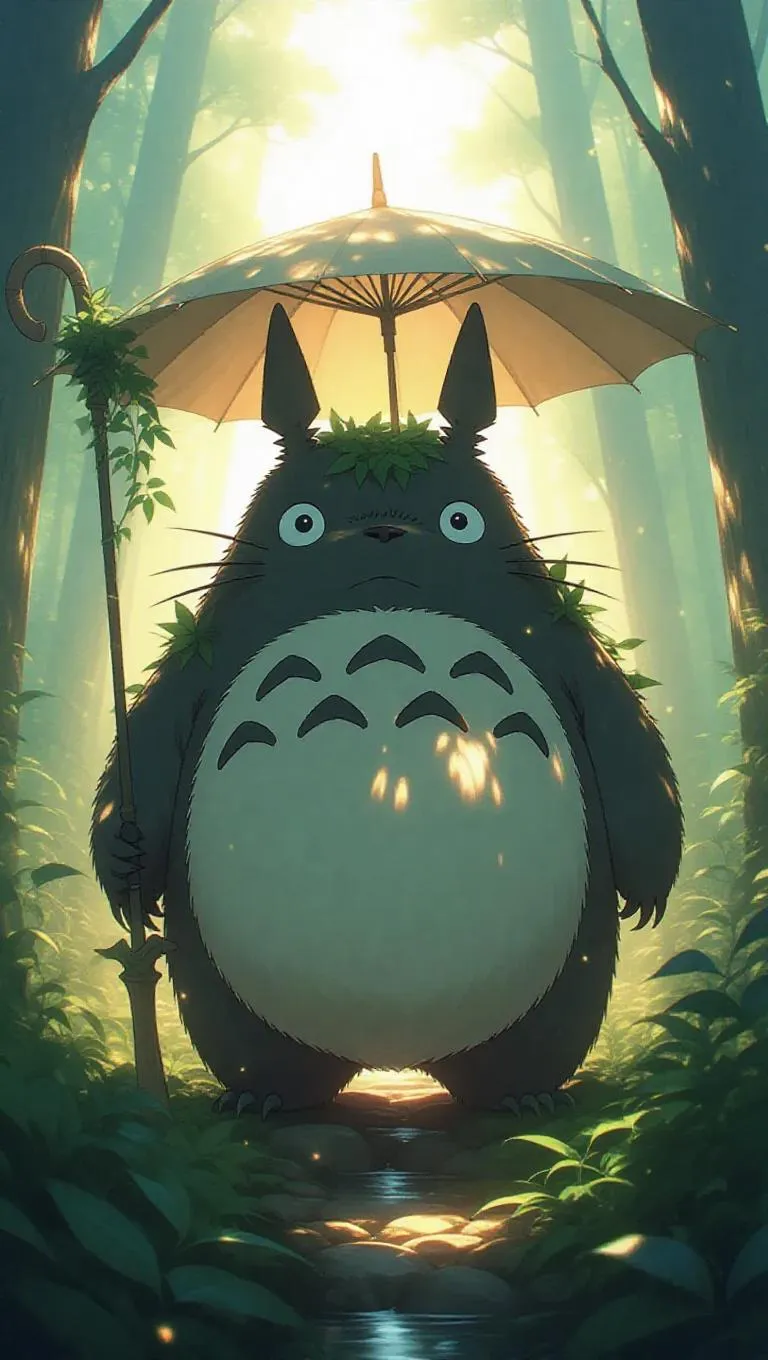 Totoro stands tall in an enchanted forest, his fur matted and eyes glowing a vibrant green. Clad in elvish armor intricately fused with leaves and vines, he wields a shimmering umbrella as a formidable weapon. Sunlight filters through the trees, with fireflies flickering amidst the thick foliage, creating a magical and serene backdrop. The scene is bathed in soft, dappled lighting, with gentle shadows and ethereal highlights, emphasizing the tranquility of the moment. The style is a blend of fantasy and nature, capturing both the mystical and the peaceful.