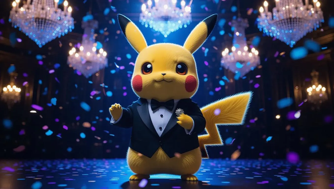 Pikachu, donned in a classy tuxedo, stands tall at a glamorous ball. Its cheeks flicker with electricity, and its charming eyes reflect the sophisticated, elegant atmosphere. Floating confetti cascades around it, adding a festive yet classy ambiance. The venue is lit with sparkling chandeliers, creating a dazzling glow that enhances the scene's allure. The style is a blend of realism and anime, capturing Pikachu's charismatic stance and the lavish beauty of the environment.