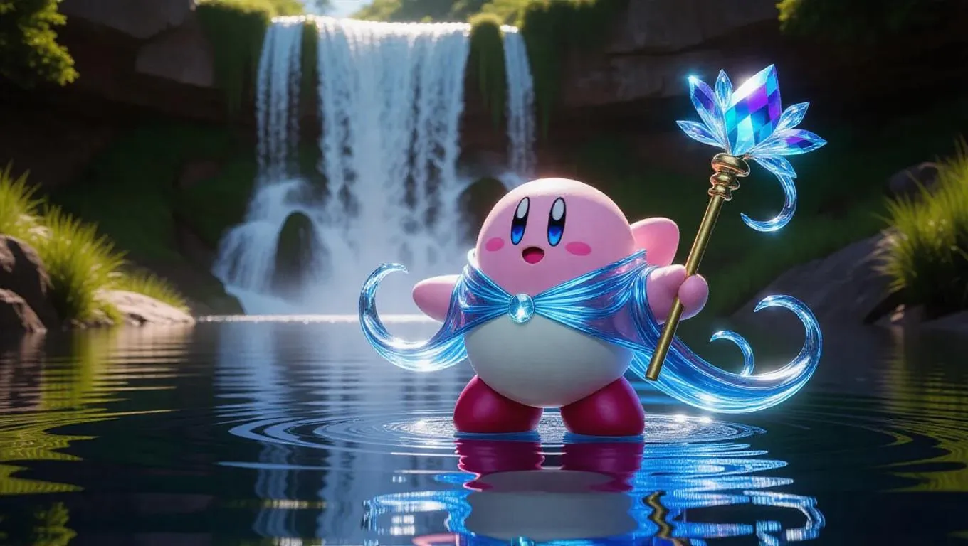 Kirby, reimagined as a powerful elemental, dons shimmering water-like robes that swirl with liquid light. He holds a staff crowned with a crystal, his eyes radiating wisdom. Floating above a serene lake, rippling waters and dancing reflections surround him, adding to the tranquil atmosphere. Behind him, a majestic waterfall cascades, its waters sparkling in the sunlight and casting a radiant glow across the landscape. The scene is bathed in soft, natural lighting, emphasizing the gentle contrast between Kirby's elemental presence and the beauty below. The style is a blend of fantasy and nature, creating a visually harmonious and captivating image.