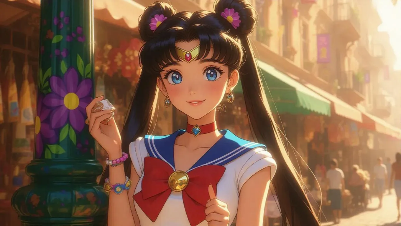 Sailor Moon leans against a graffiti-covered lamp post in a lively market, her tiara replaced with a floral bandana and a snack in hand. Her colorful sailor outfit flows in the breeze, while handmade crafts flutter beside her. The scene is enriched with warm, bustling shadows, with a combination of earthy and vibrant colors. The style is bohemian, merging artisanal elements with street style.