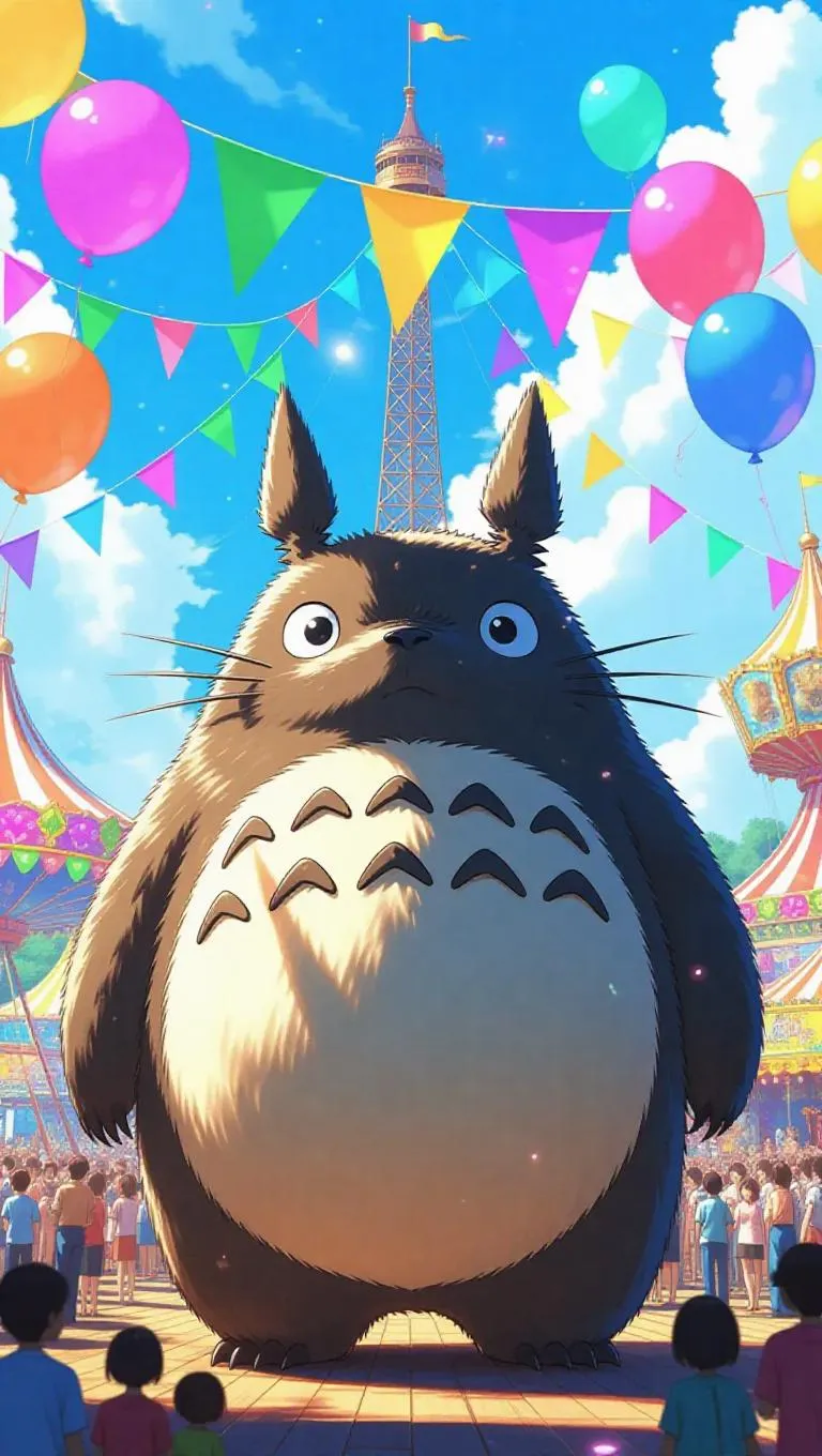 Totoro stands tall amidst a vibrant carnival, his large, furry body dwarfing the towering rides. Colorful balloons float around him, casting joyful shadows, while bright banners and lights fill the scene with festive energy. Totoro's eyes sparkle with delight, his whiskers twitching as he observes the cheerful crowd. Soft, twinkling fairy lights highlight his gentle expression, creating a whimsical blend of nature and celebration. The style is a combination of realistic and cartoonish, emphasizing the lively yet enchanting atmosphere.