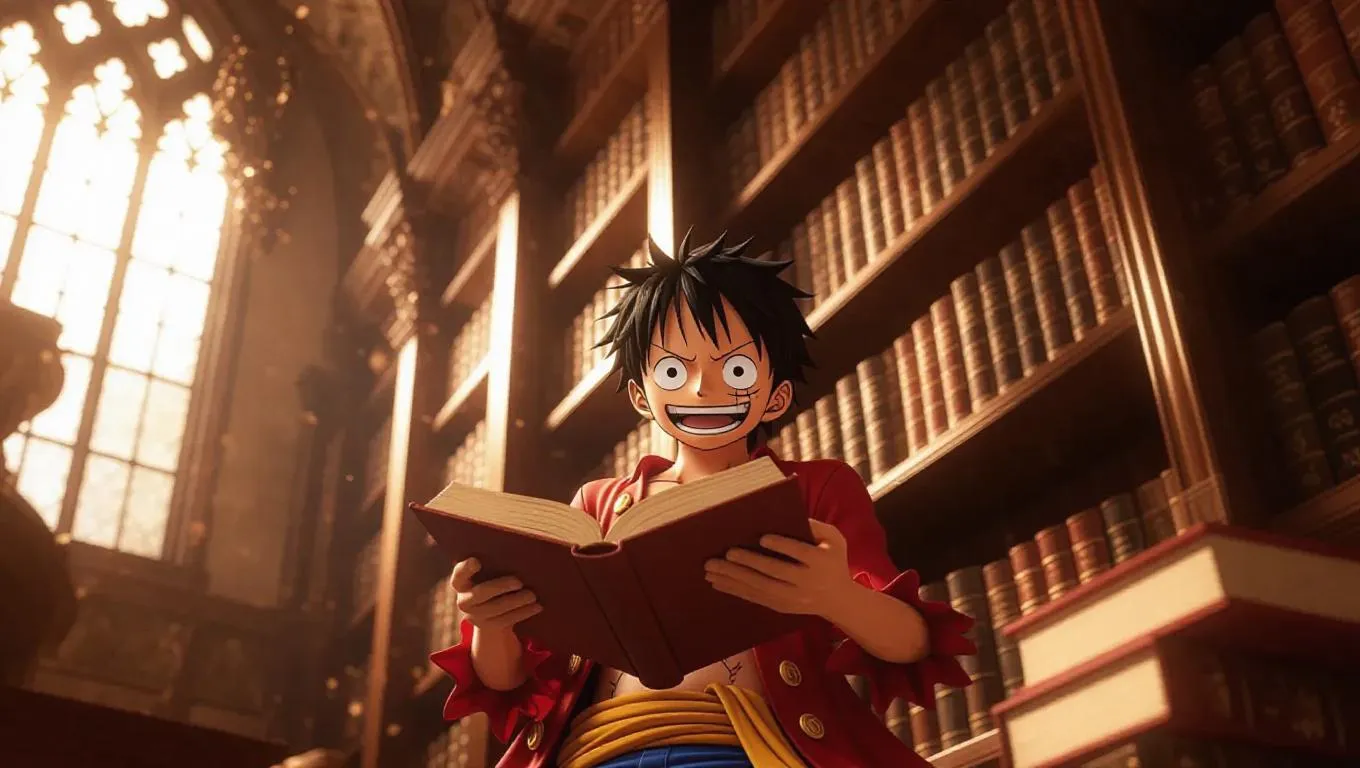 Luffy from One Piece, dressed in a superhero costume, stands amidst towering bookshelves in a grand library. He is energetically organizing books, his expressive face showing a mix of concentration and excitement. The warm, ambient lighting casts soft shadows, highlighting the rich wooden shelves and the intricate architectural details. The scene exudes a cozy, inviting atmosphere, blending the whimsical charm of Luffy with the timeless elegance of a classic library.
