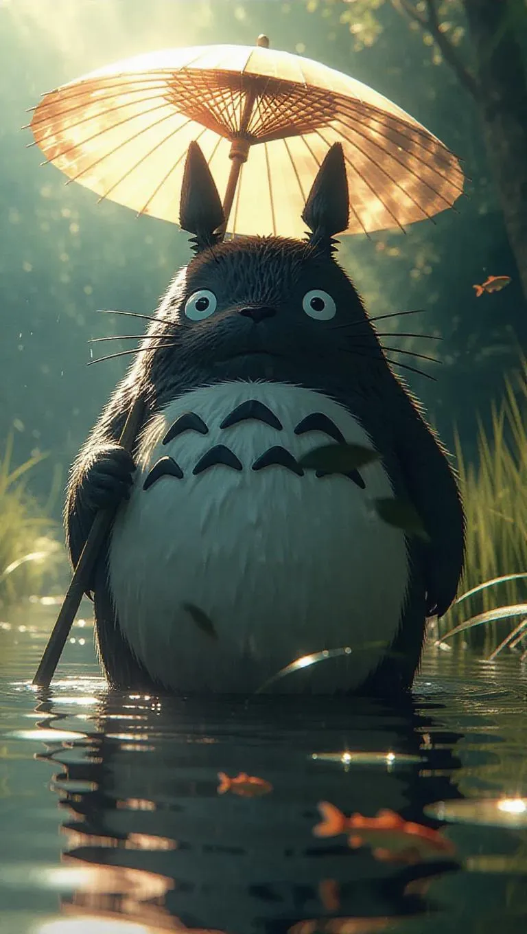 Totoro stands tall in a flowing river, his fur matted and eyes glowing a fierce azure. Clad in water-resistant attire intricately fused with reeds and aquatic life, he wields a shimmering umbrella as a formidable weapon. Mist rises off the water, with fish swimming beneath the surface, creating a tranquil and refreshing backdrop. The scene is bathed in natural, cool lighting, with soft shadows and sparkling highlights, emphasizing the serenity of the moment. The style is a blend of aquatic beauty and realism, capturing both the calmness and the life.