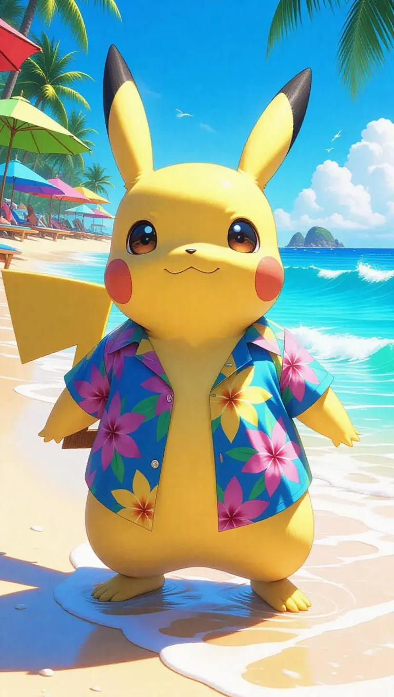 Pikachu, wearing a vibrant Hawaiian shirt, stands tall on a sunny beach. Its cheeks spark with electricity, and its carefree eyes reflect the bright, joyful atmosphere. Waves crash playfully in the background, adding a lively yet relaxing ambiance. The beach is alive with colorful beach umbrellas, creating a cheerful glow that enhances the scene's warmth. The style is a blend of realism and anime, capturing Pikachu's relaxed stance and the idyllic beauty of the environment.
