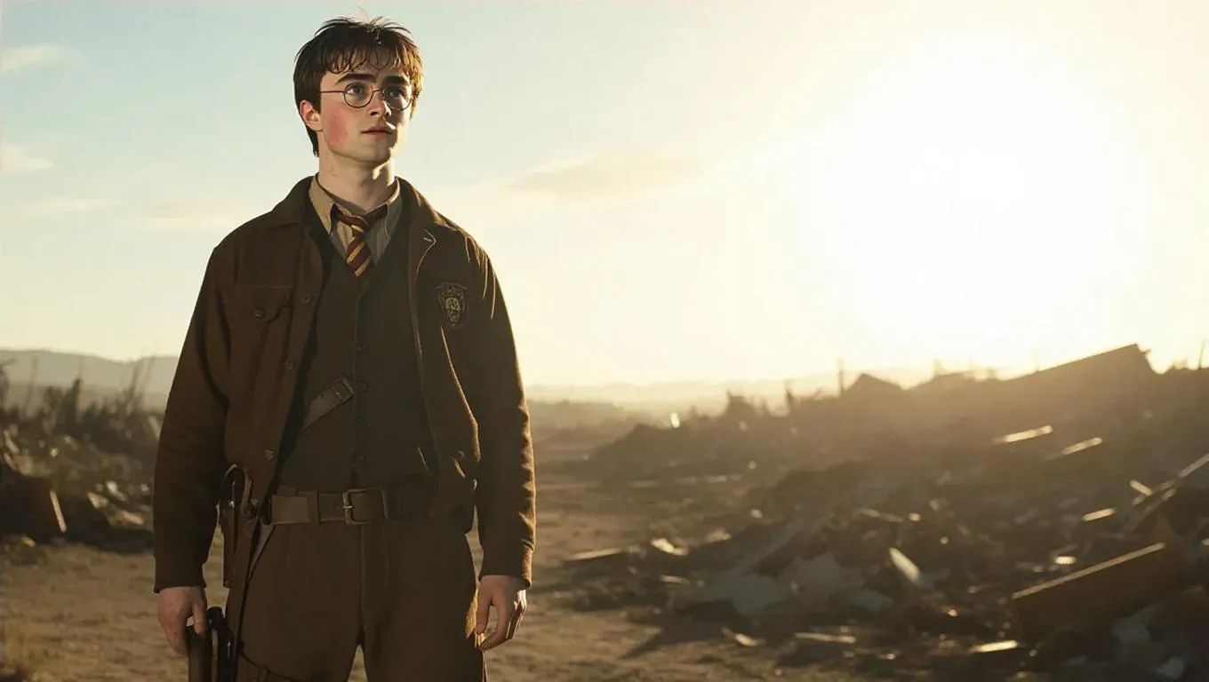 Harry Potter, dressed in a rugged survival suit with a utility belt, stands in a desolate wasteland. Surrounded by debris and remnants of a lost civilization, he scans the horizon with determination. Harsh sunlight casts dramatic shadows on his resolute expression, accentuating the resolve in his gaze. The landscape is filled with the echoes of the past, creating a somber atmosphere. The lighting is primarily from the sun and the dusty air, giving the scene a bleak, post-apocalyptic feel. Style: Dystopian.