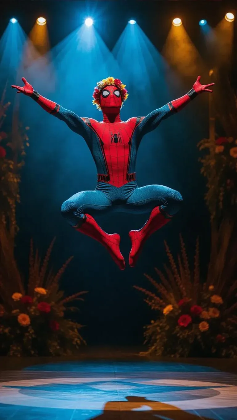 Spider-Man, dressed in a colorful, bohemian outfit with a flower crown, performs a mid-air twirl on a nature-inspired stage. His muscles are taut, capturing the dynamic tension of his leap. The theater is adorned with floral decorations and earthy tones, creating an elegant backdrop. Dramatic spotlights cast a mix of warm sunlight and cool shadows, highlighting his form and casting long shadows, enhancing the theatricality of the scene. The style blends the realism of Spider-Man's superhero physique with the free spirit of bohemian dance.