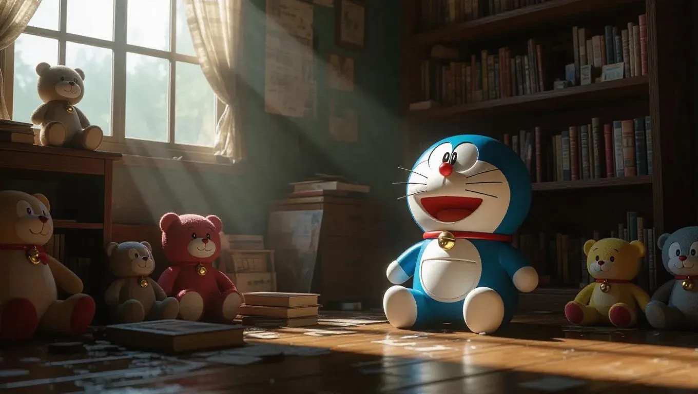 A photorealistic scene of Doraemon, now a malfunctioning AI companion, leaking oil and sitting in an abandoned child's room. The room is cluttered with stuffed animals and old books, evoking a sense of history. A single ray of twilight sunlight streams through a cracked window, casting a soft glow on Doraemon, highlighting the contrast between his metallic surface and the vintage decor around him.