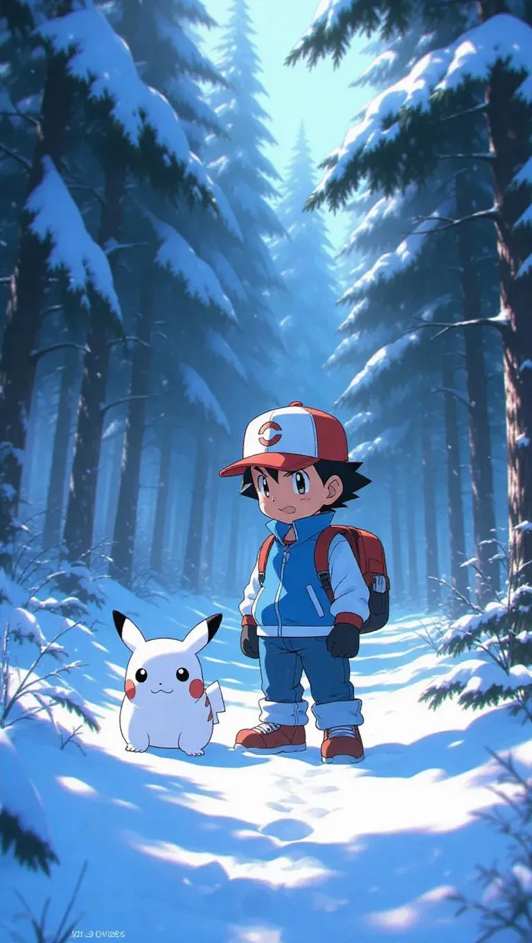 Ash Ketchum, a nostalgic Pokémon trainer, explores a snowy forest, his snug cap and thick Pokéball belt providing warmth against the chill. A snow-covered Pikachu figure stands next to him, its white exterior blending with the landscape. The forest is draped in white, with soft blues and silvers reflecting the cold, creating a tranquil and peaceful atmosphere. The scene is rendered in a realistic winter style, capturing the serene beauty of the environment.