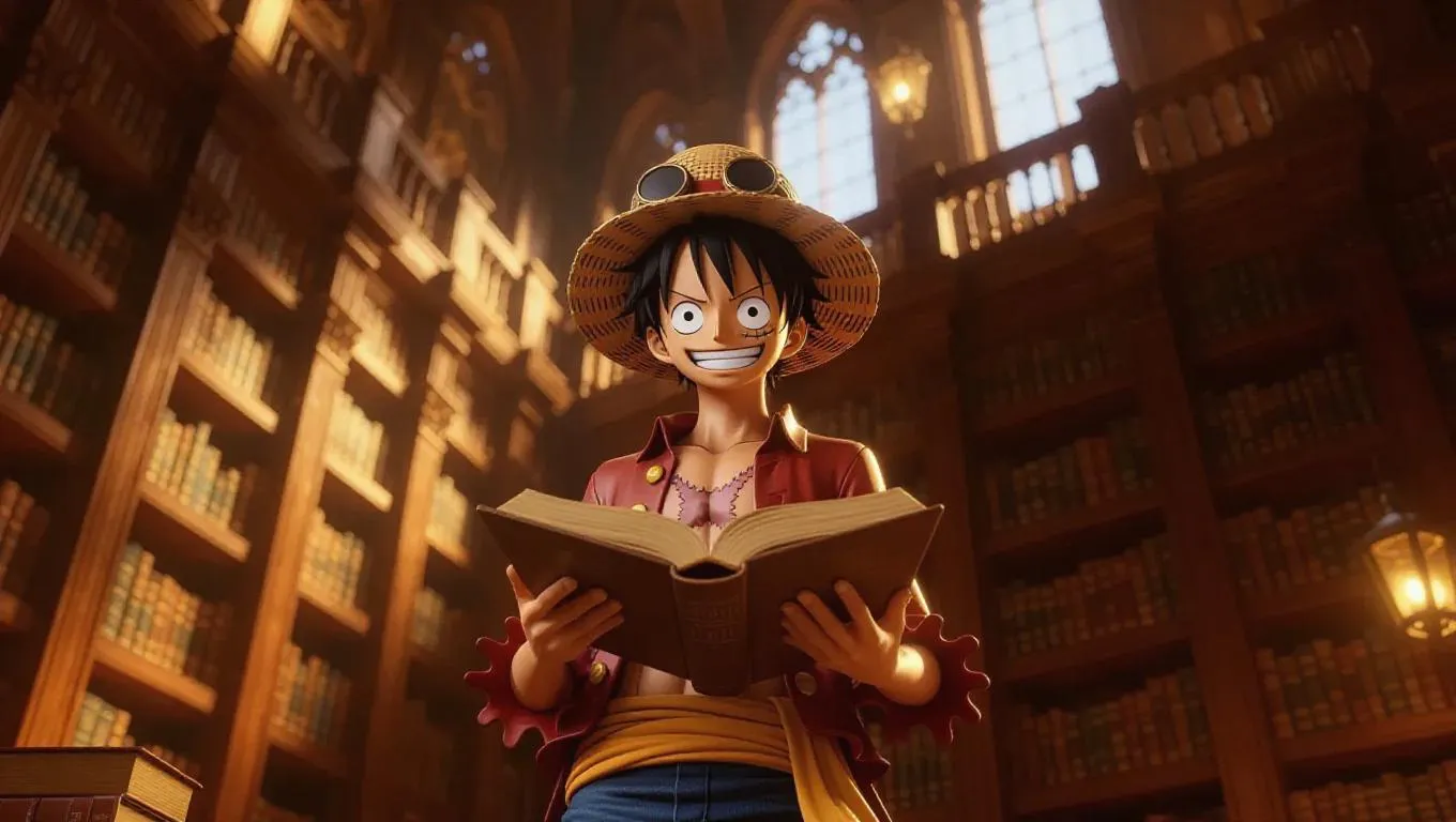 Luffy from One Piece, dressed in a steampunk outfit, stands amidst towering bookshelves in a grand library. He is energetically organizing books, his expressive face showing a mix of concentration and excitement. The warm, ambient lighting casts soft shadows, highlighting the rich wooden shelves and the intricate architectural details. The scene exudes a cozy, inviting atmosphere, blending the whimsical charm of Luffy with the timeless elegance of a classic library.