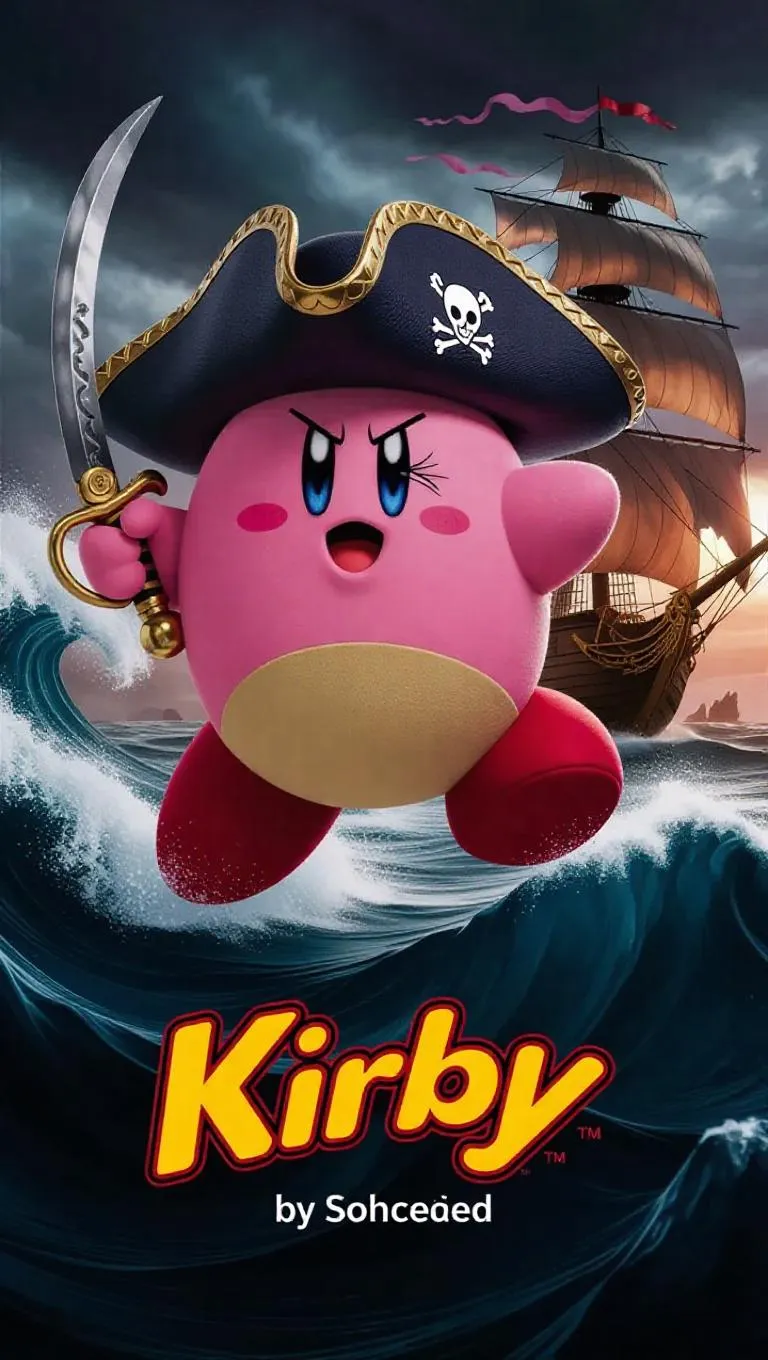 Kirby, reimagined as a fearsome pirate captain, dons a rugged tricorn hat that flutters in the ocean breeze. He holds a cutlass, his eyes gleaming with heroism. Floating above a treacherous sea, crashing waves and swirling winds surround him, adding to the dramatic atmosphere. Behind him, a ghostly ship sails, its sails glowing and casting an eerie light across the turbulent waters. The scene is enveloped in dynamic, stormy lighting, emphasizing the tense contrast between Kirby's daring spirit and the chaos of the ocean below. The style is a blend of adventure and thrill, creating a visually gripping and intense image.