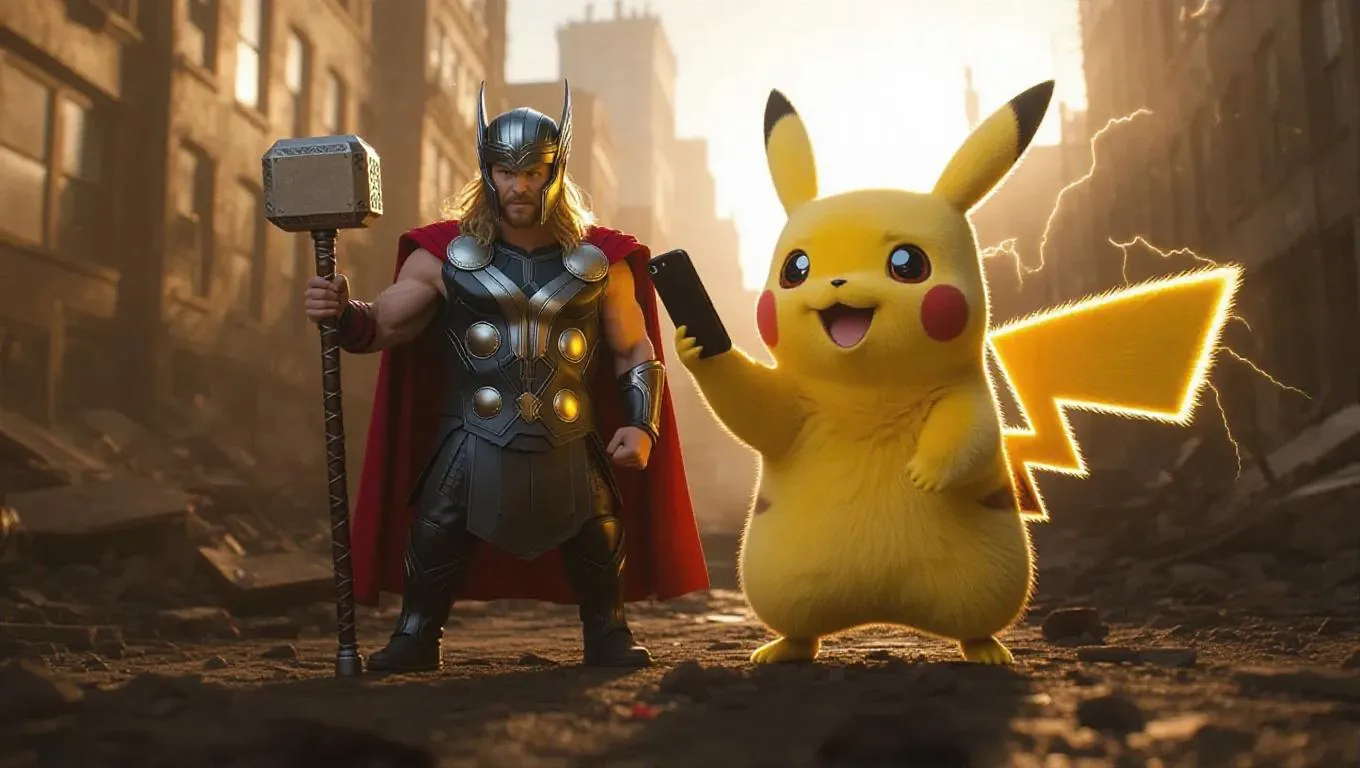 In a photorealistic 8K quality scene, Pikachu and Thor stand side by side, grinning as they take a selfie with their smartphones. Thor's hammer glows with a pale yellow aura, while Pikachu is surrounded by crackling thunder. The comical juxtaposition is set against a backdrop of a dusty gray, devastated city, remnants of Thor’s chaotic battles. Soft, warm light from the setting sun casts long shadows, adding a surreal, almost whimsical touch to the urban ruin.