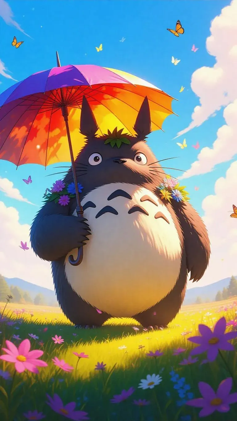 Totoro stands tall on a peaceful meadow, his fur matted and eyes glowing a fierce red. Clad in a tribal outfit intricately fused with flowers and feathers, he wields a colorful umbrella as a formidable weapon. Clear skies loom overhead, with butterflies dancing amidst the gentle breeze, creating a serene and vibrant backdrop. The scene is bathed in warm, soft lighting, with gentle shadows and subtle highlights, emphasizing the calmness of the moment. The style is a blend of whimsical and natural elements, capturing both the enchanting and the lively.