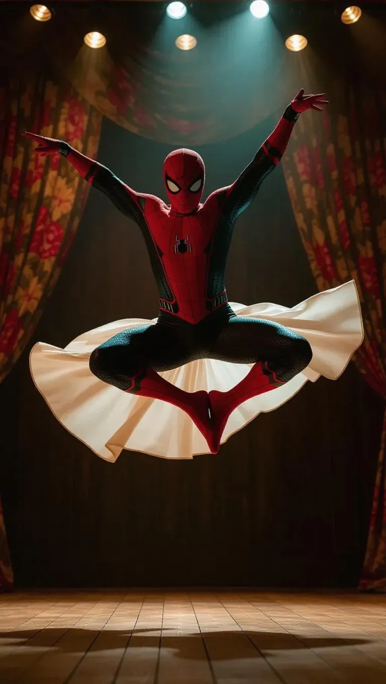 Spider-Man, dressed in a flowing, white folk dance costume with a black mask, performs a mid-air pirouette on a rustic stage. His muscles are taut, capturing the dynamic tension of his leap. The theater is adorned with wooden accents and bright floral curtains, creating an elegant backdrop. Dramatic spotlights cast a mix of soft and bright colors, highlighting his form and casting long shadows, enhancing the theatricality of the scene. The style blends the realism of Spider-Man's superhero physique with the tradition of folk dance.