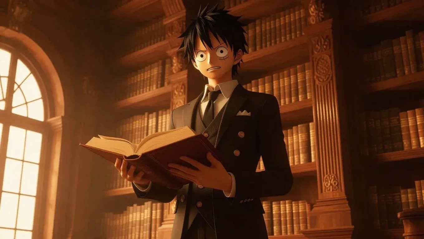 Luffy from One Piece, dressed in a formal suit, stands amidst towering bookshelves in a grand library. He is energetically organizing books, his expressive face showing a mix of concentration and excitement. The warm, ambient lighting casts soft shadows, highlighting the rich wooden shelves and the intricate architectural details. The scene exudes a cozy, inviting atmosphere, blending the whimsical charm of Luffy with the timeless elegance of a classic library.