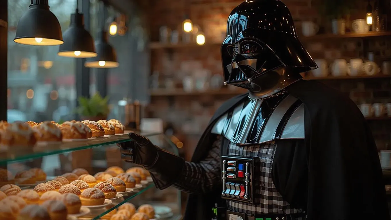 Darth Vader stands in a chic café, wearing a checked apron over his dark armor. He curates a selection of pastries on a glass shelf, his expression focused yet gentle. The café is modern and stylish, with industrial decor and cozy nooks. Bright, natural light streams through large windows, creating dramatic contrasts and illuminating the pastries. The scene combines the powerful figure of Vader with the delicate art of pastry selection.