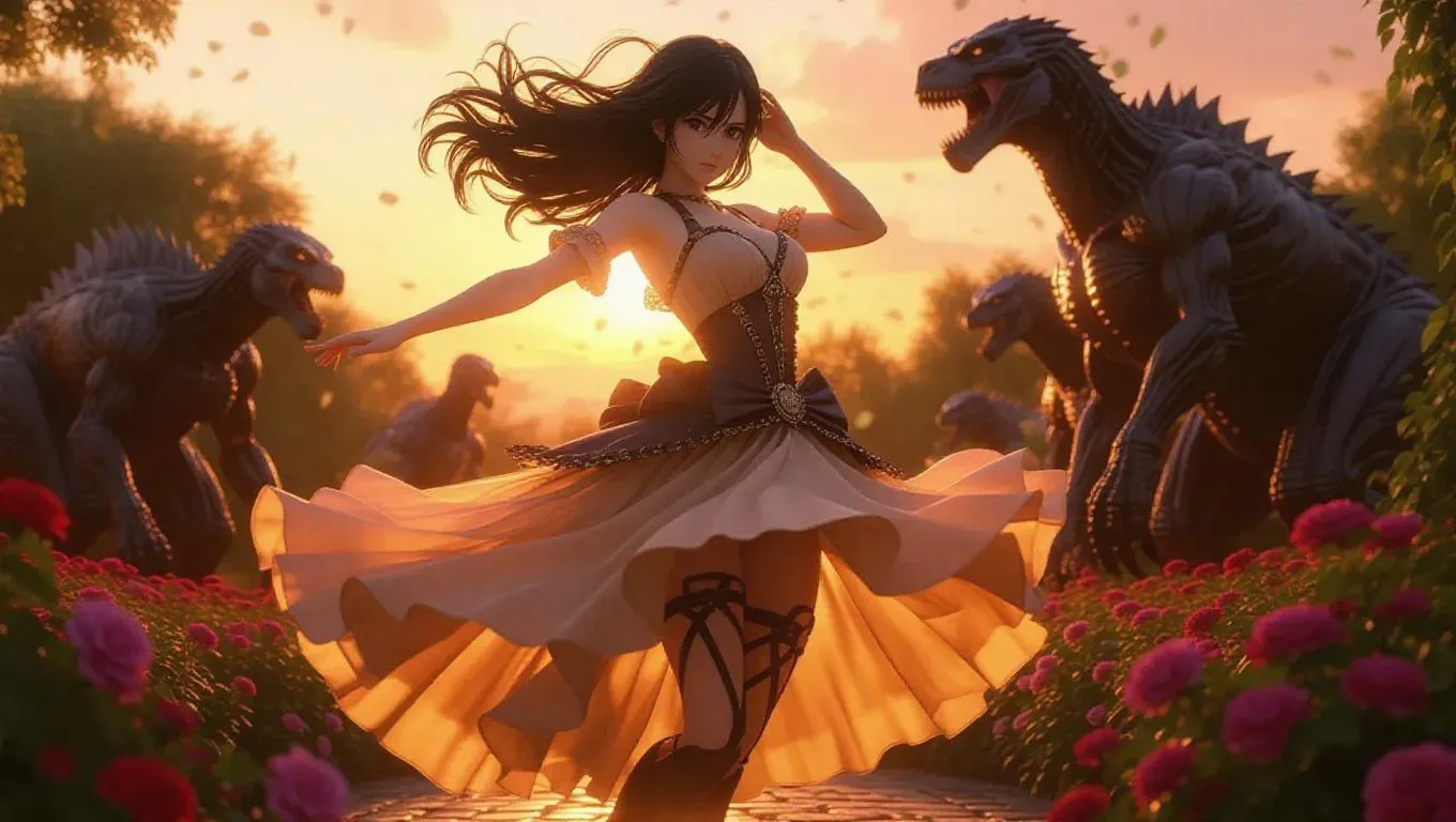 Mikasa from *Attack on Titan* dances gracefully in the midst of a Victorian garden, twirling in a flowing gown. She wears an ornate dress adorned with jewels, her dark hair elegantly styled. Titans observe her with curiosity, resembling mythical beasts in the background. Colorful sunset hues paint the sky, creating a romantic ambiance. The garden is sprawling and lush, filled with fragrant blossoms. The lighting is warm and dramatic, capturing the beauty of the moment and the surreal presence of titans.