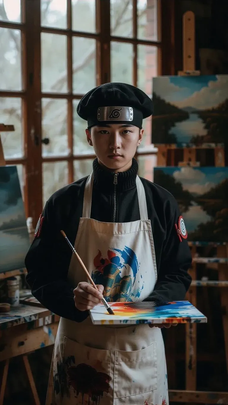 Naruto, a calm artist in a tranquil studio, wears a canvas apron and holds a paintbrush. His ninja headband has been replaced by a beret. The soft natural light flows through the windows, creating an inspiring ambiance, showcasing canvases on the walls, adding a creative tone to the art scene. The style is serene, capturing the peaceful studio atmosphere.