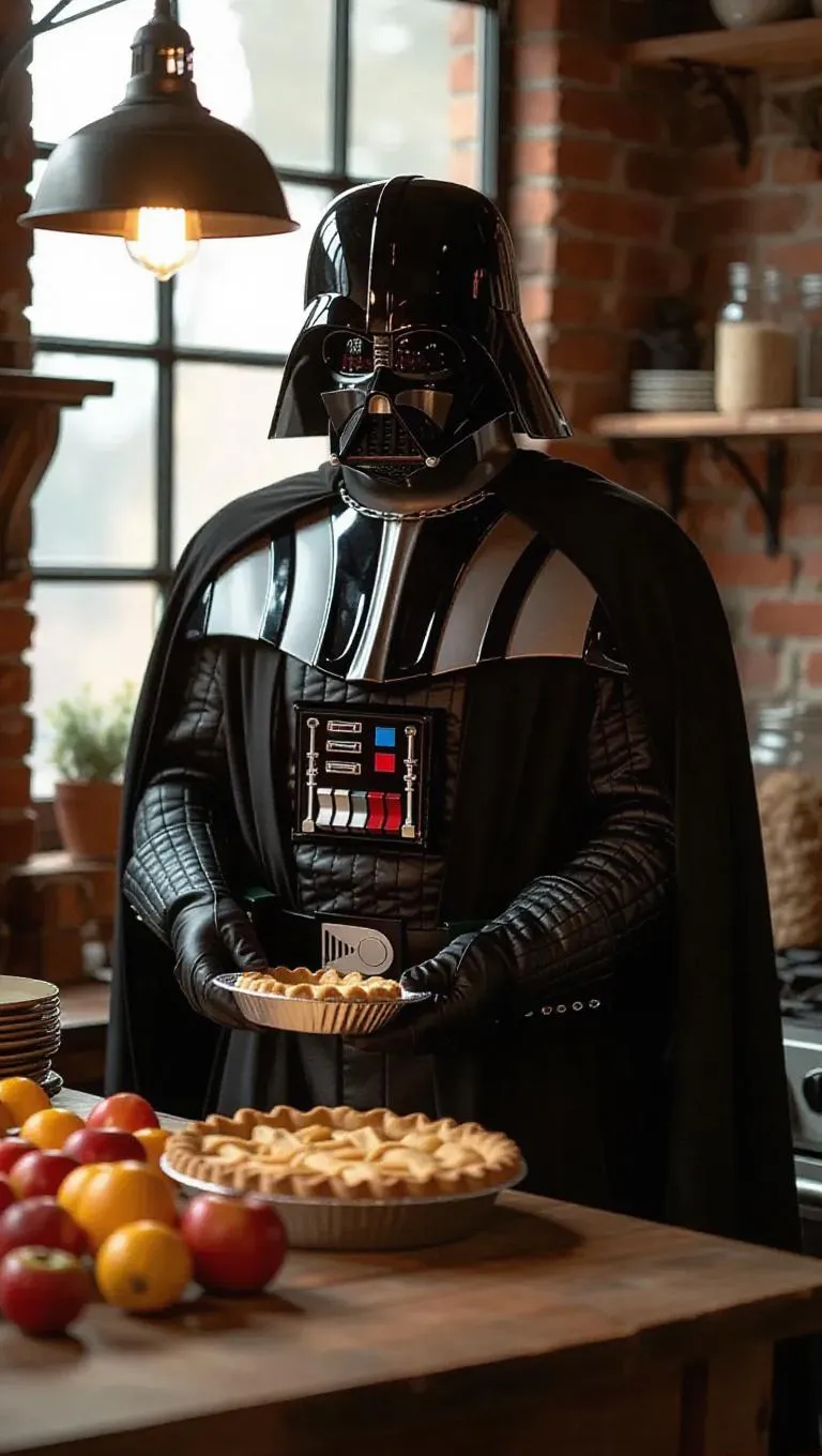 Darth Vader stands in a rustic café, wearing a black apron over his traditional attire. He deftly prepares a pie on a wooden counter, his expression concentrated yet soft. The café is quaint and charming, featuring brick walls and a vintage chandelier. Warm, orange light radiates from a hanging lamp, casting playful shadows and accentuating the fruits laid out on the table. The scene combines Vader's intimidating form with the delightful process of baking.