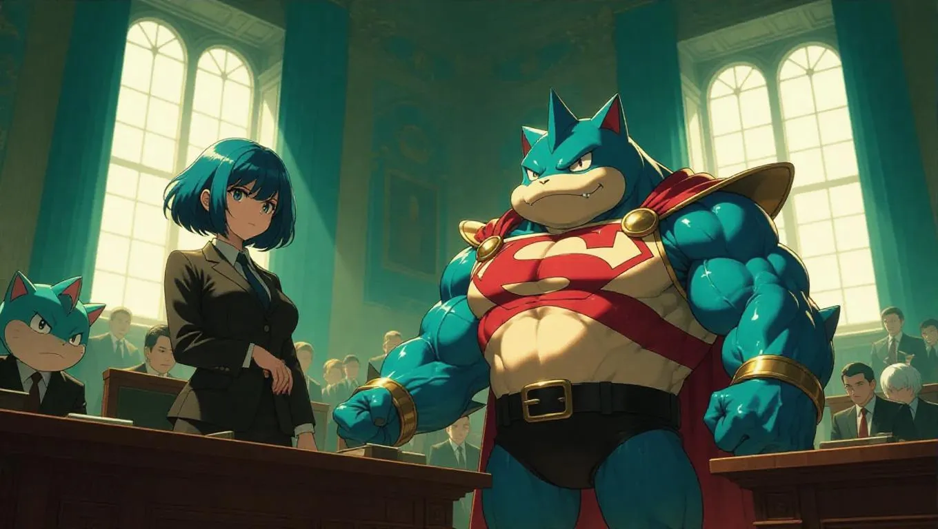 In a chaotic courtroom, Machamp stands accused of war crimes, dressed in a flashy superhero costume. Misty, his loyal lawyer, stands confidently by his side, while a judge, glares with fierce authority. The surreal and absurd atmosphere is heightened by the presence of various Pokémon witnesses and a judge presiding over the proceedings. Bright, chaotic lighting casts wild shadows, emphasizing the gravity of the situation while adding a touch of whimsy. The scene is rendered in a dynamic comic book style, blending the mundane with the fantastical.