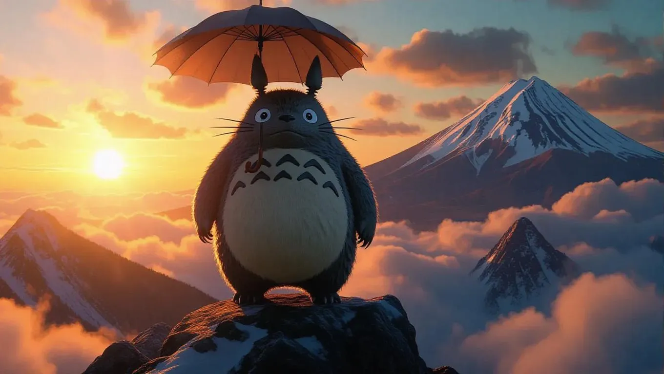Totoro stands tall on a mountain peak, his fur matted and eyes glowing a fierce orange. Clad in rugged hiking gear intricately fused with rocks and ice, he wields a sturdy umbrella as a formidable weapon. Majestic mountains loom in the distance, with the sun setting amidst the clouds, creating a breathtaking and cinematic backdrop. The scene is bathed in golden, warm lighting, with long shadows and rich highlights, emphasizing the grandeur of the moment. The style is a blend of realism and natural beauty, capturing both the majesty and the wilderness.