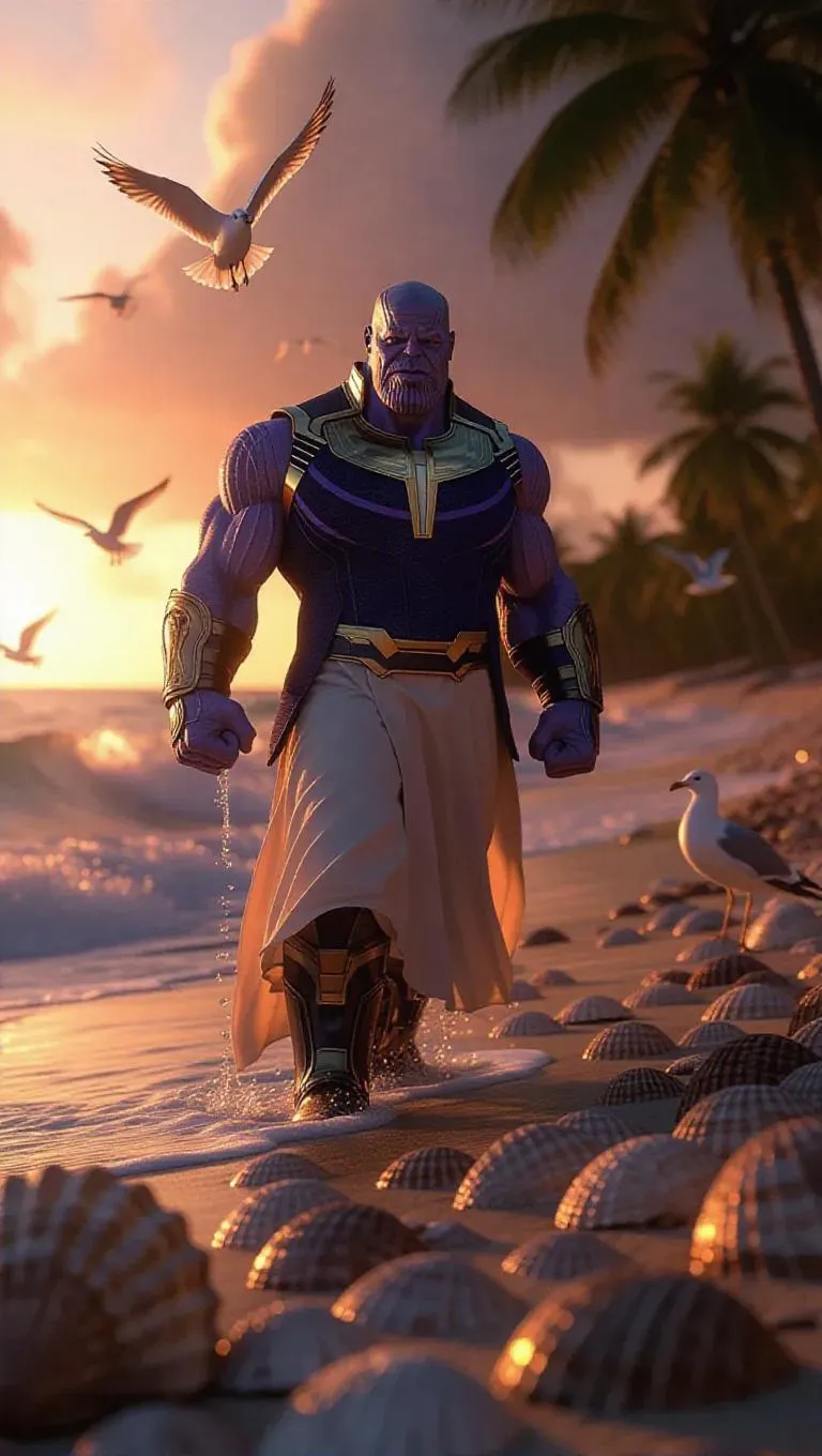 Thanos, wearing a flowing white garment, navigates a peaceful ocean beach filled with seashells and palm trees. He waters delicate coastal flora, his huge hands displaying tenderness. Seagulls caw above, enhancing the serene atmosphere. The beach glows under a vibrant sunset, casting a warm light over the sand. The scene is idyllic and refreshing, contrasting Thanos's typical ferocity with tranquility.