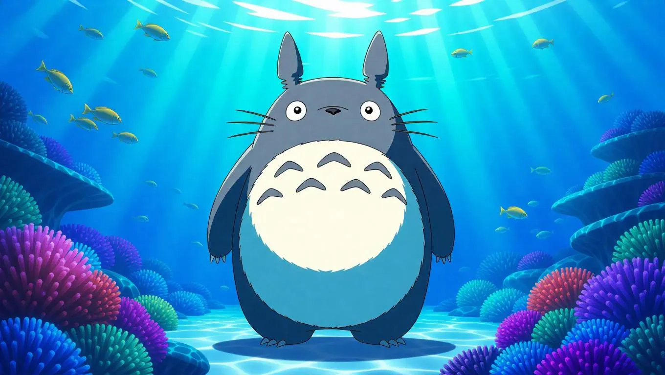Totoro stands tall amidst a mystical underwater realm, his large, furry body dwarfing colorful coral reefs. Bioluminescent creatures swim around him, casting shifting shadows, while sunlight filters through the water, bathing the scene in vibrant blues and greens. Totoro's eyes glow with curiosity, his whiskers twitching as he observes the enchanting marine life. Soft, swirling light from above highlights his gentle expression, creating a dreamy blend of nature and fantasy. The style combines realistic and surreal art, emphasizing the captivating yet ethereal environment.