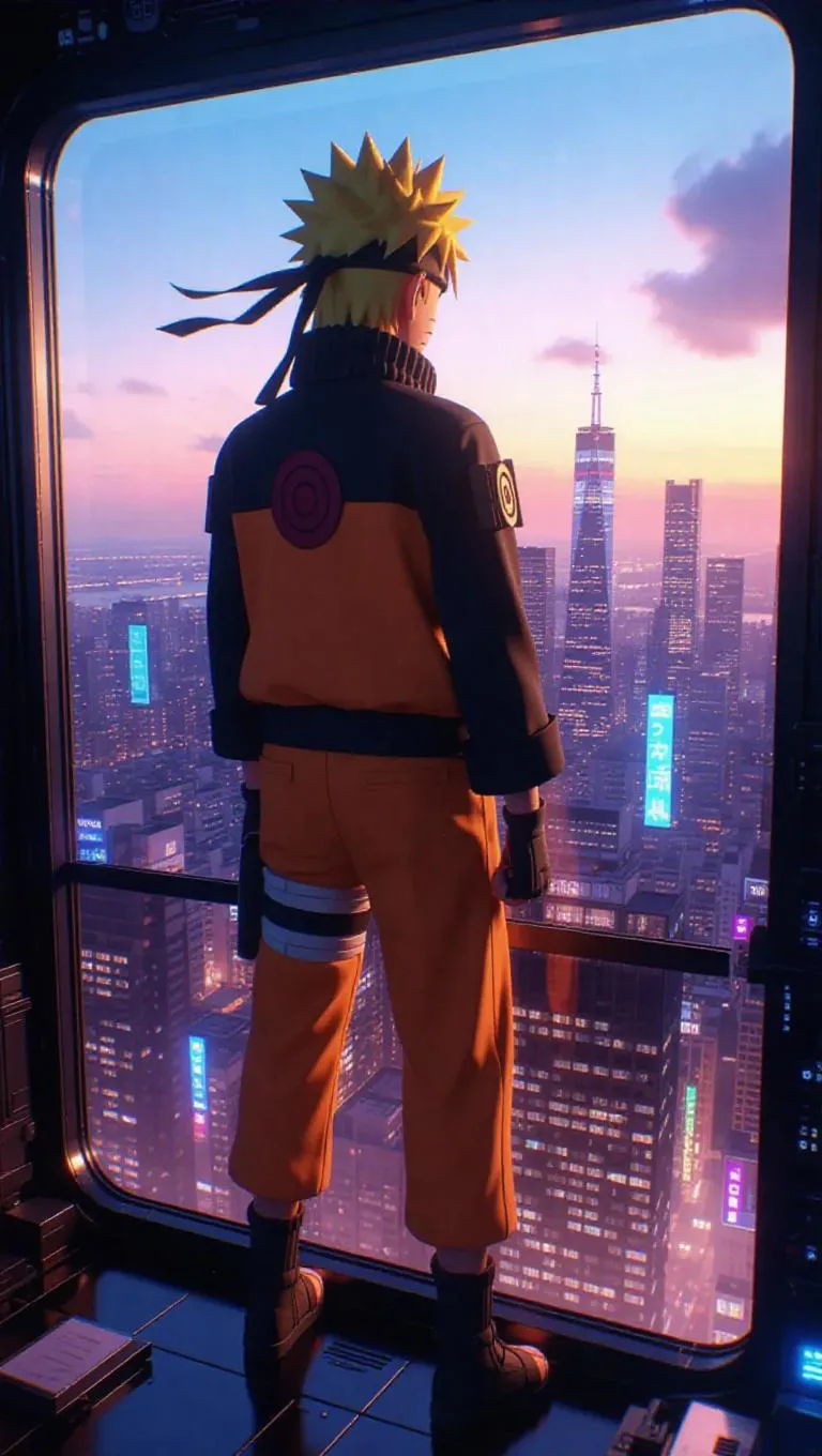 Naruto, dressed in a futuristic combat suit with his signature spiky blonde hair, stands confidently at the window of a high-tech lab. He overlooks a sprawling cityscape at dusk, where holographic advertisements glow, creating a sci-fi and innovative scene. The room is bathed in the cool light of technology, with neon reflections enhancing Naruto's determined expression. The style is a blend of realism and cyberpunk aesthetics, emphasizing the clash between his traditional training and modern advancements.