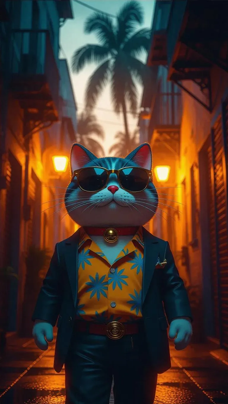 Doraemon, reinterpreted as a noir gumshoe, wanders through a damp alley in 1980s Miami. He wears a vibrant Hawaiian shirt beneath a retro blazer, with sunglasses perched on his nose. His gadget pouch contains cryptic, radiant tech. The warm neon lighting casts playful shadows, juxtaposing the noir style. The hazy glow from palm trees sways in the background, intensifying the feeling of intrigue. This composition merges tropical vibes with classic noir themes.