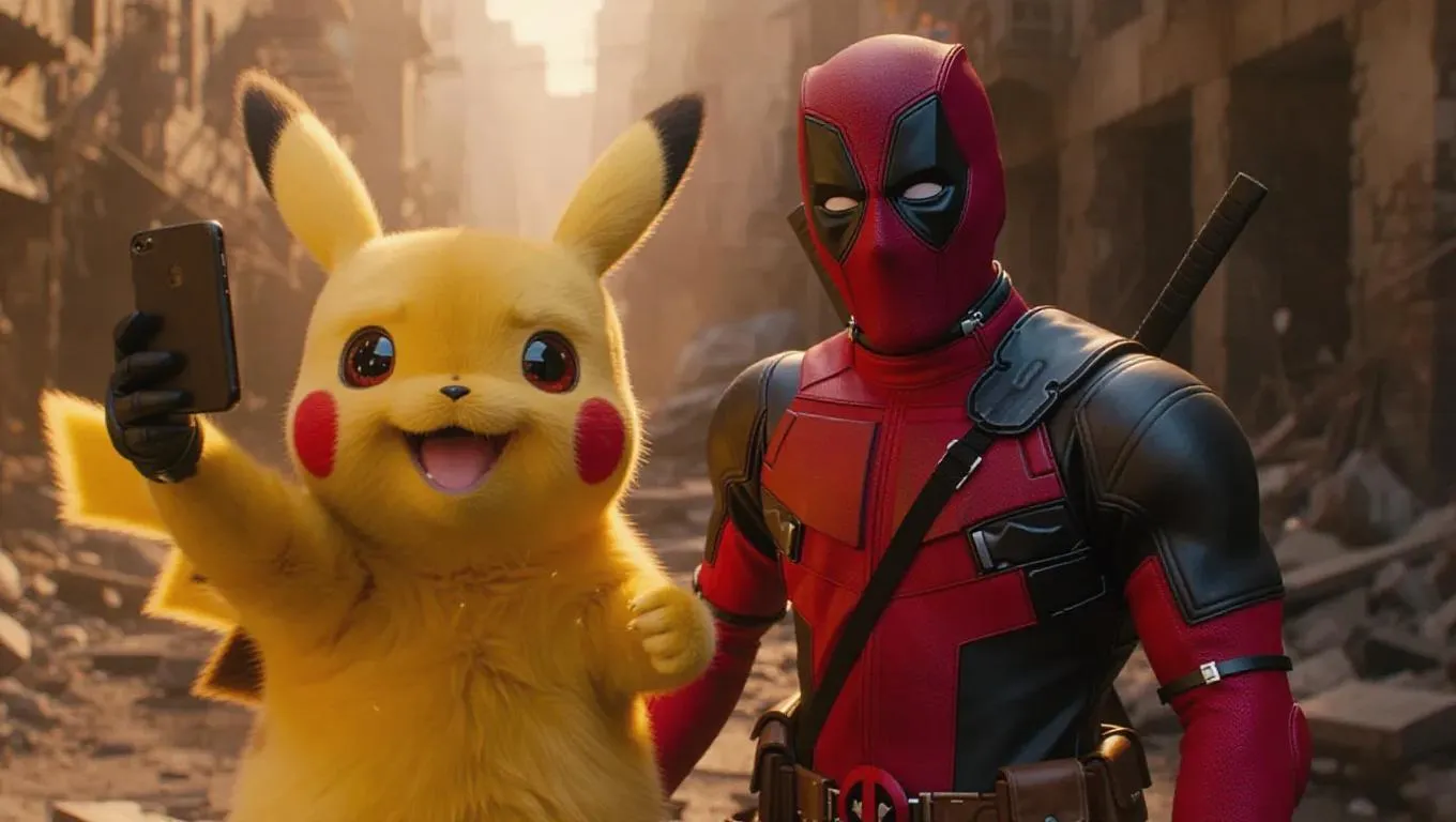 In a photorealistic 8K quality scene, Pikachu and Deadpool stand side by side, grinning as they take a selfie with their smartphones. Deadpool’s suit glows with a dark red aura, while Pikachu is surrounded by crackling humor. The comical juxtaposition is set against a backdrop of a dusty gray, devastated city, remnants of Deadpool’s antics. Soft, warm light from the setting sun casts long shadows, adding a surreal, almost whimsical touch to the urban ruin.