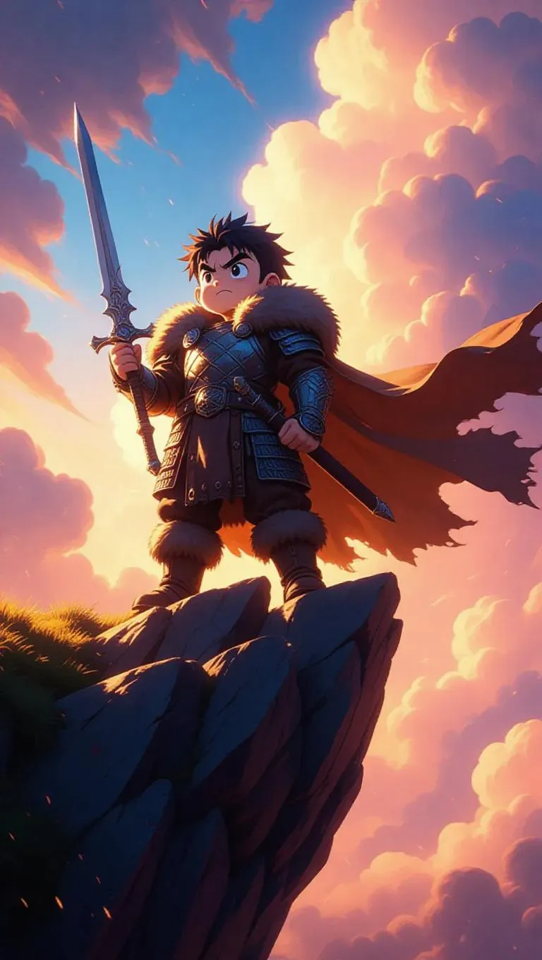 Shin Chan, transformed into a mighty barbarian, stands valiantly on a rugged cliff. He wears fur-lined armor and a weathered cloak, his determined expression illuminated by the glow of his enchanted sword. The magical sky above is filled with swirling storm clouds, bathed in soft, warm light that casts gentle shadows and highlights. The scene is rendered in a high-fantasy style, with vibrant colors and meticulous detail, capturing the ethereal beauty of the moment.