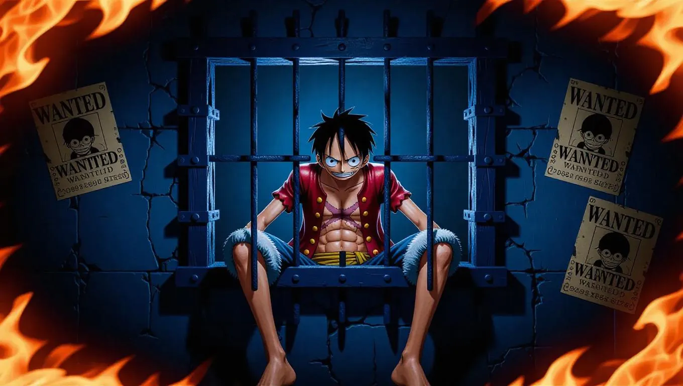 Luffy from One Piece, restrained and weak, stares out from a damaged window in a sinister lockup. His once colorful figure is now thin and frail, his eyes depicting a mixture of hope and defeat. The walls are scarred with tally marks and peeling "Wanted" posters. The dim, azure-toned background is illuminated by bold flames, casting dynamic shadows and enhancing the dramatic vibe. The scene is captured in an expressive style, showcasing the tension and despair of the environment.