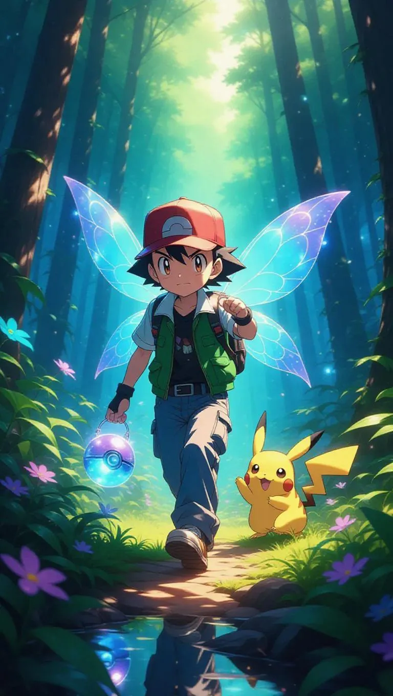 Ash Ketchum, a battle-weary Pokémon trainer, ambles through an enchanted forest, his whimsical cap and twinkling Pokéball belt signifying magic. A fairy-like Pikachu dances around him, its fairy dust shimmering through the air. The forest is alive with vibrant colors and soft sparkles, creating a fantastical and joyful atmosphere. The scene is rendered in a fantasy art style, enhancing the dreamlike beauty of the environment.