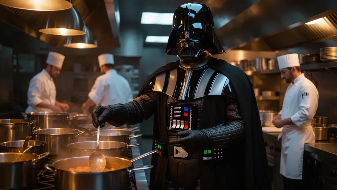 Darth Vader stands in a bustling kitchen, wearing a striped apron over his combat gear. He passionately stirs a pot on the stove, his expression intense yet warm. The kitchen is lively and colorful, filled with busy chefs and culinary tools. Bright, overhead lights shine brightly, casting energetic shadows and highlighting the bubbling sauce. The scene merges Vader's authority with the dynamic ambiance of professional cooking.