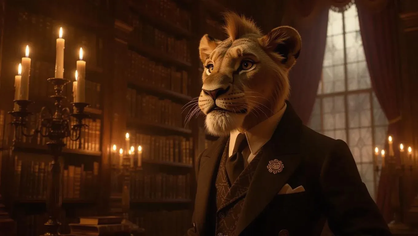 Simba, the lion detective, wanders into an opulent library filled with ancient tomes. He is dressed in a dapper three-piece suit, reflecting his intellect. His eyes scan the shadows between the shelves, always searching for hidden secrets. The dim candlelight casts warm glows that flicker and create deep shadows, inviting mystery to the surroundings. The overall feel is sophisticated and cerebral, adopting a literary, film noir essence.