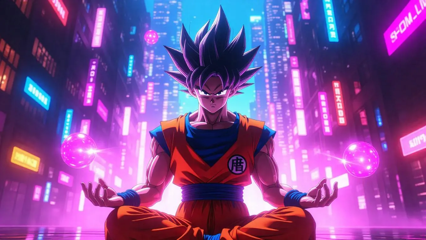 Goku meditates alone in a futuristic cityscape, his hair a shimmering silver. His high-tech jumpsuit ripples in the wind as neon Dragon Balls hover nearby. Ultralight sources generate stark highlights, mingling with the colorful city lights, creating a lively and electric atmosphere.