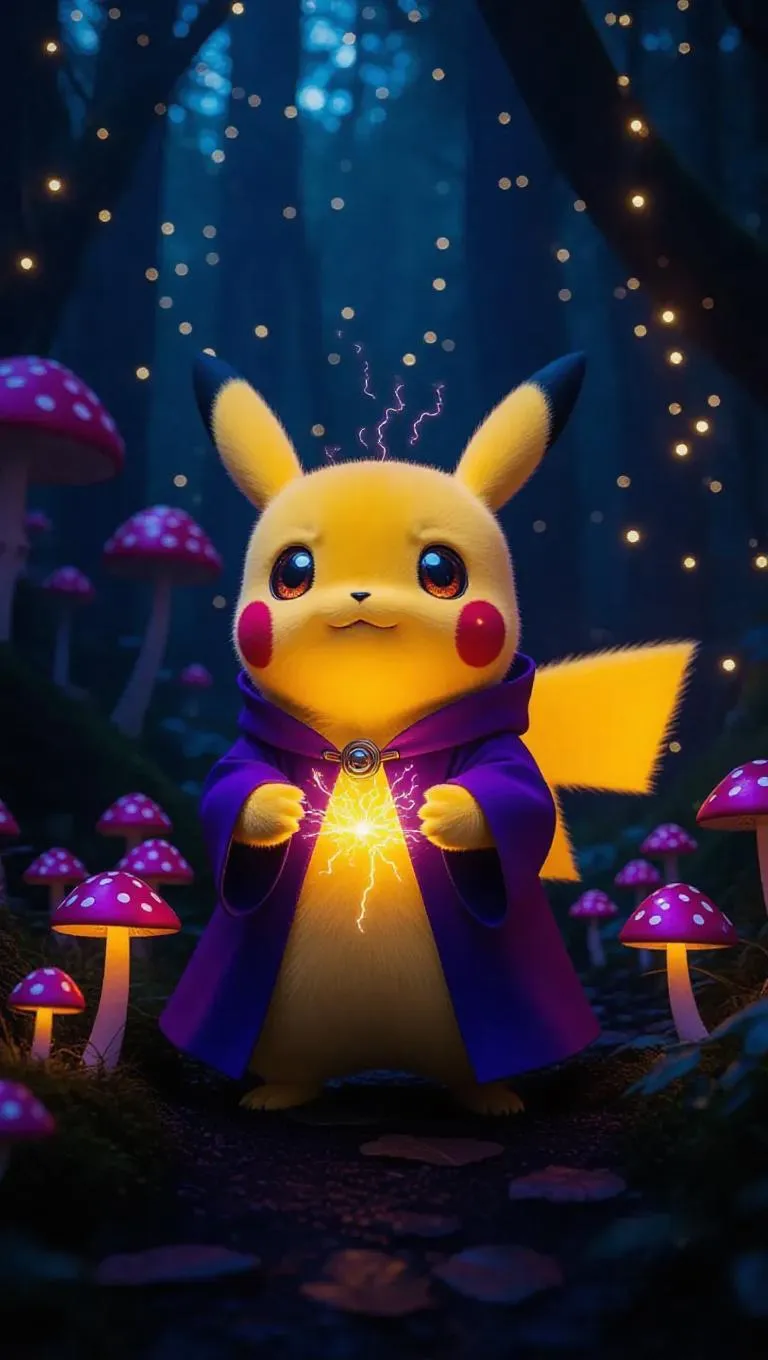 Pikachu, wearing a vibrant wizard's robe, stands tall in an enchanted forest filled with glowing mushrooms. Its cheeks shimmer with electricity, and its curious eyes reflect the magical, inviting atmosphere. Sparkling fairy lights float gently around it, adding a whimsical yet mysterious ambiance. The forest is illuminated with dappled, filtered light, creating a dreamy glow that enhances the scene's enchantment. The style is a blend of realism and anime, capturing Pikachu's inquisitive stance and the enchanting beauty of the environment.