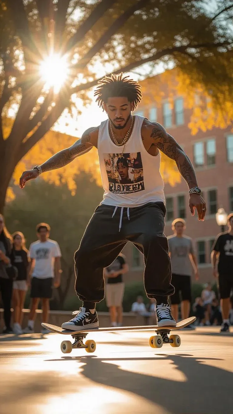 Aladdin, adorned in a sporty tank and sweatpants, showcases impressive skateboard tricks in a lively college campus park. His dynamic movements and confident expressions draw in fellow students. The park is surrounded by academic buildings and sculptures, establishing an intellectual backdrop. Soft, golden sunlight filters through, casting warm, diffused light that highlights the dynamic action and the vibrancy of campus life.