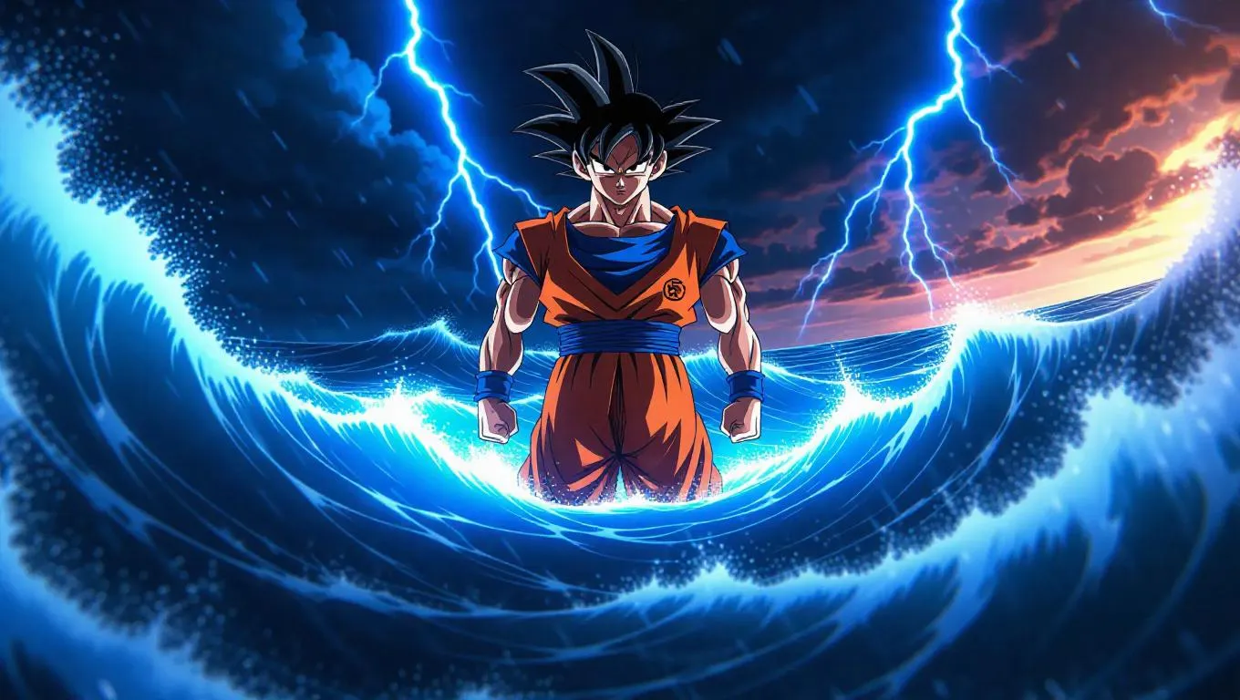Goku, adorned in a futuristic armor, floats gracefully above a swirling ocean during a storm. His eyes are focused, and his expression is calm, showing concentration amidst chaos. The ocean's waves crash fiercely, creating an electrifying atmosphere with flashes of lightning illuminating the dark skies. The light is stark and contrasting, heightening the dramatic tension of the setting. The scene is rendered in a vibrant style, highlighting the energy and tumult of nature.