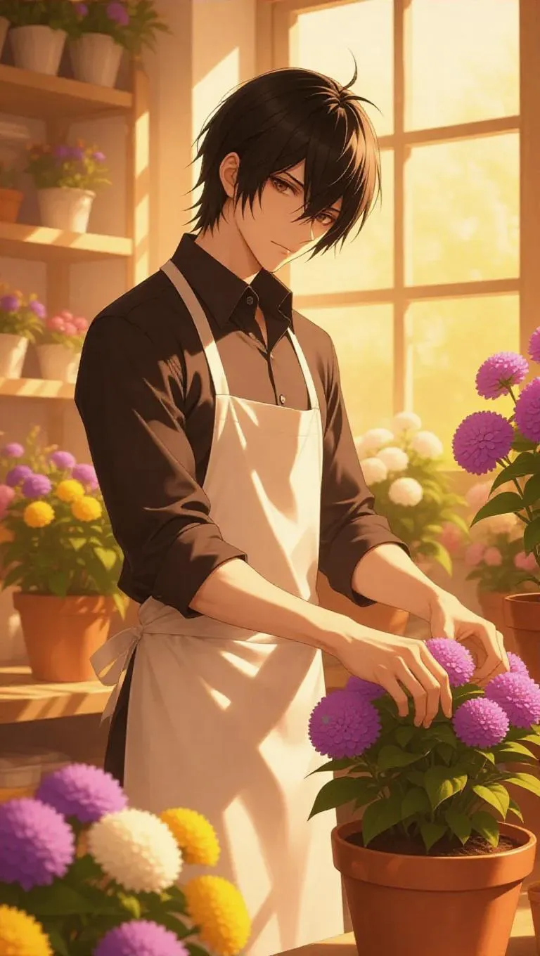 Light Yagami, sporting a florist’s apron, stands in a shop, arranging flowers with a weary expression. His sharp features are slightly dulled by the monotony of the task. The Death Note is discreetly placed inside a flower pot, adding a dark contrast to the colorful, fragrant atmosphere. Customers browse arrangements, and he assists with a forced smile, his eyes betraying his inner turmoil. Soft, natural light casts a cheerful tone, creating a warm setting. The style is realistic, with a touch of psychological tension.