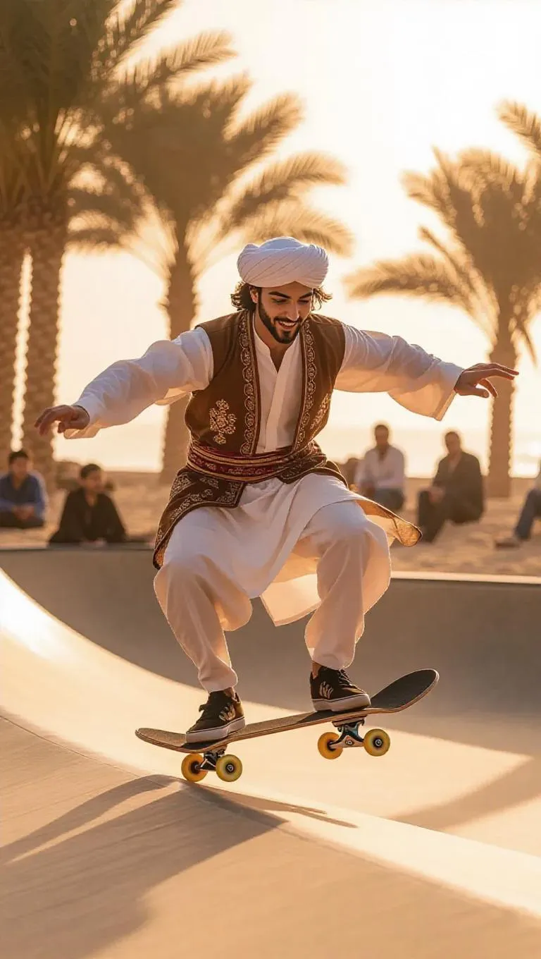 Aladdin, dressed in a traditional djellaba with a stylish cap, performs incredible skateboard tricks in a serene coastal skate park. His graceful movements and joyful expressions charm a small group of beachgoers. The park is decorated with sandy dunes and palm trees, creating a calming backdrop. Soft, golden sunlight filters through, casting warm, diffused light that highlights the dynamic action and creates a sense of energy and excitement.