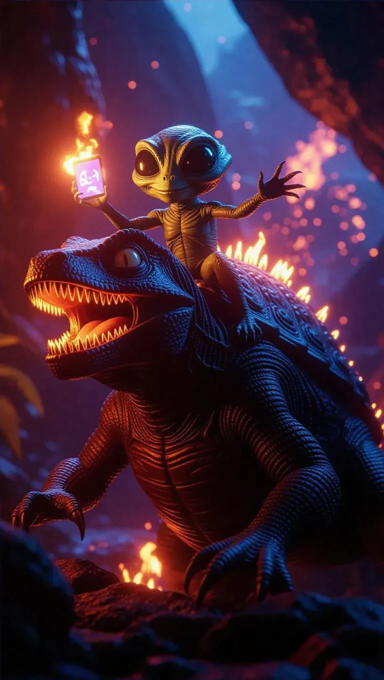 A photorealistic 8K quality scene captures an alien creature riding on the shell of the monstrous Gamera, who is breathing fiery flames. The alien, with an enthusiastic expression, takes a selfie with a holographic device. The background shows an otherworldly landscape, with glowing plants and floating rocks. Luminescent light casts dramatic shadows, enhancing the comical yet chaotic atmosphere. The style is hyper-realistic, blending humor with destruction.