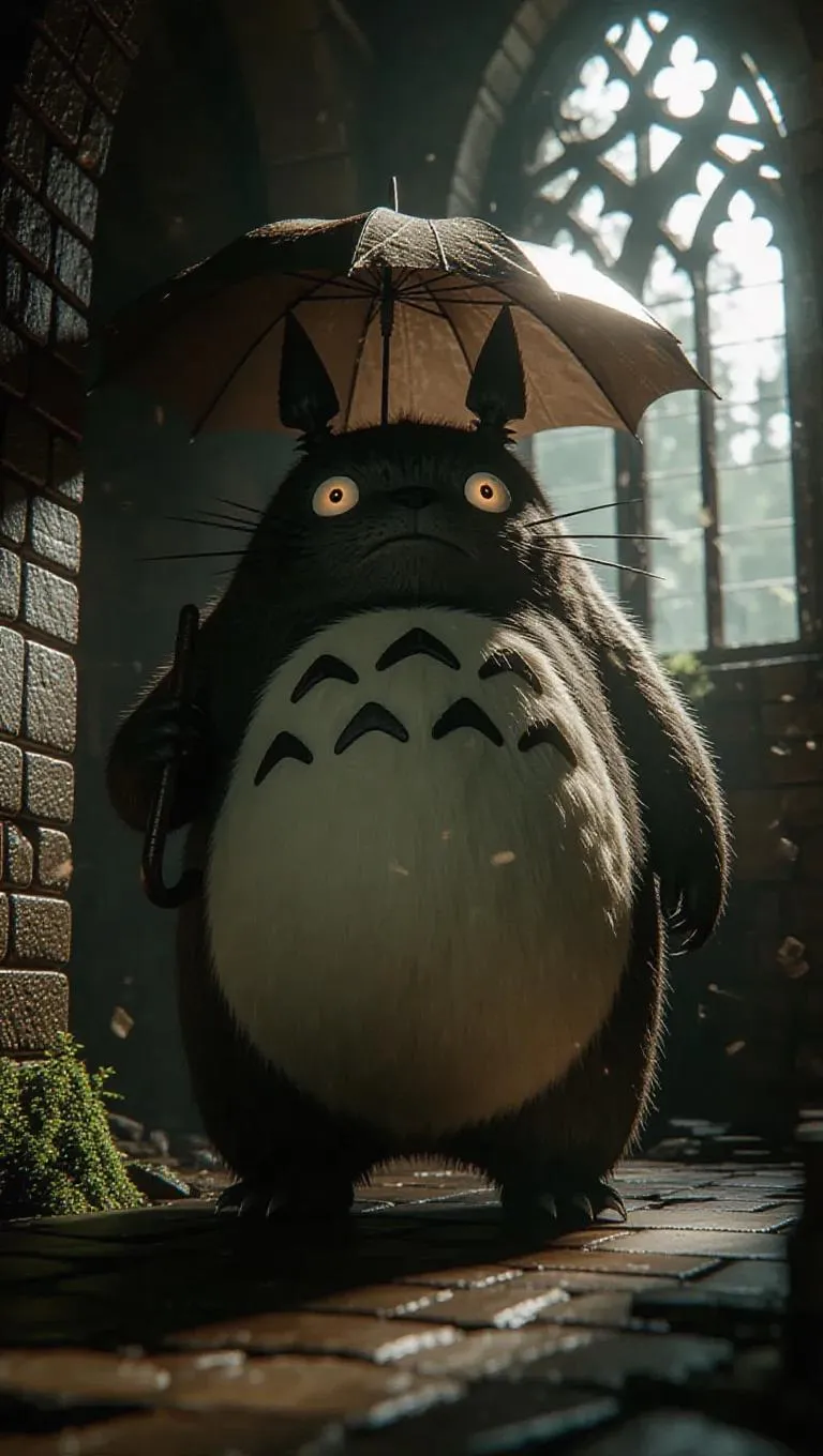 Totoro stands tall inside a crumbling castle, his fur matted and eyes glowing a fierce orange. Clad in knightly armor intricately fused with ancient runes and bricks, he wields a jagged umbrella as a formidable weapon. Gloomy skylights filter through, with dust motes dancing amidst the decay, creating a haunting yet regal backdrop. The scene is bathed in dim, brooding lighting, with sharp shadows and flickering highlights, emphasizing the mystery and history of the moment. The style is a blend of gothic and fantasy elements, capturing both the eerie and the majestic.