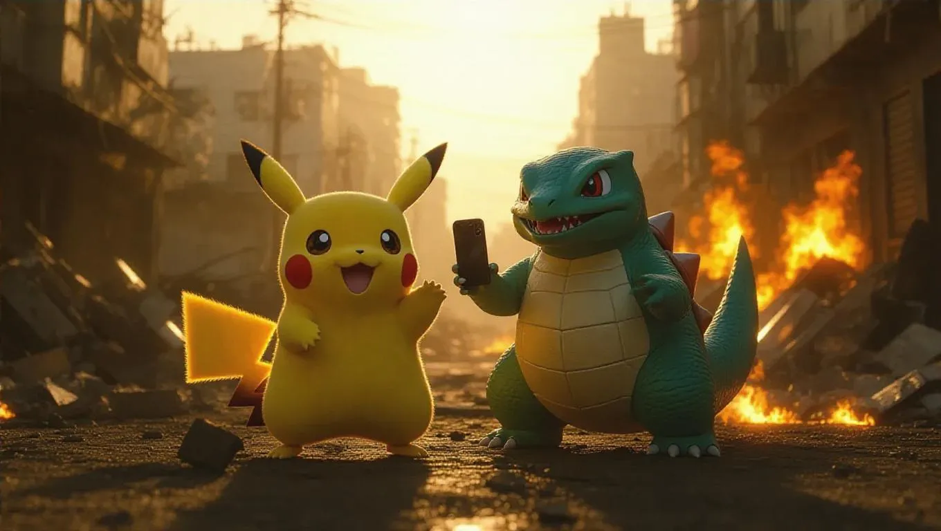 In a photorealistic 8K quality scene, Pikachu and Gamera stand side by side, grinning as they take a selfie with their smartphones. Gamera’s back glows with a pale green aura, while Pikachu is surrounded by crackling fire. The comical juxtaposition is set against a backdrop of a dusty gray, devastated city, remnants of Gamera’s destructive path. Soft, warm light from the setting sun casts long shadows, adding a surreal, almost whimsical touch to the urban ruin.