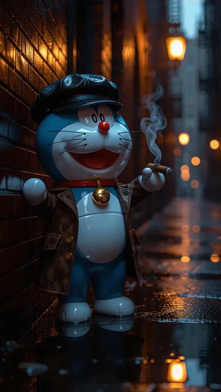 Doraemon, depicted as a noir sleuth, leans against a brick wall in a rainy alleyway of 1970s Chicago. He sports a stylish overcoat and a newsboy cap, holding a cigar with confidence. His gadget pouch is filled with bizarre, shimmering devices. The gloomy, subdued lighting elongates shadows, heightening the film noir aesthetic. A soft glow from a flickering lamp highlights the glistening puddles, adding an element of tension and mystery. The scene blends retro sci-fi elements with classic noir storytelling.
