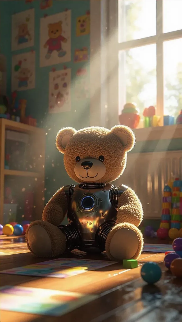 A photorealistic scene of a teddy bear, now a malfunctioning AI companion, leaking oil and sitting in a vibrant child's room. The room is filled with colorful toys and decorated with drawings, evoking a sense of nostalgia. A single ray of warm sunlight streams through a clean window, casting a bright glow on the teddy bear, highlighting the contrast between its fabric surface and the lively surroundings.