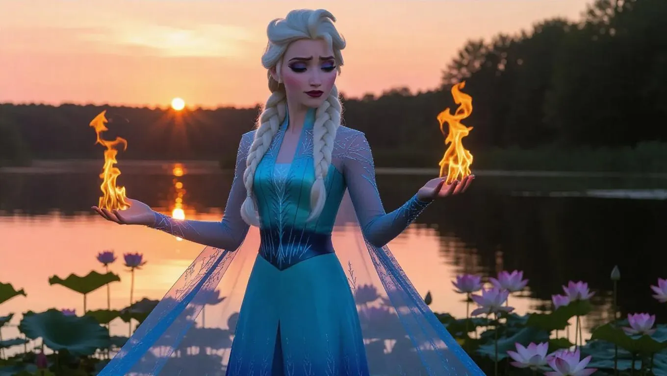 Elsa, with her icy blue hair now woven with shades of dark teal, stands gracefully in a serene lakeside. She wears a light, flowing azure dress with silver embroidery, her arms outstretched as she releases swirling flames. Still water and blooming lotus flowers surround her, adding to the tranquil, serene atmosphere. The sky is a warm peach at sunset, softly illuminating the scene. Front light highlights her peaceful countenance, while side light enhances the gentle currents of the flames. The style combines serene beauty with fantasy elements, embodying the calm of a water mage.