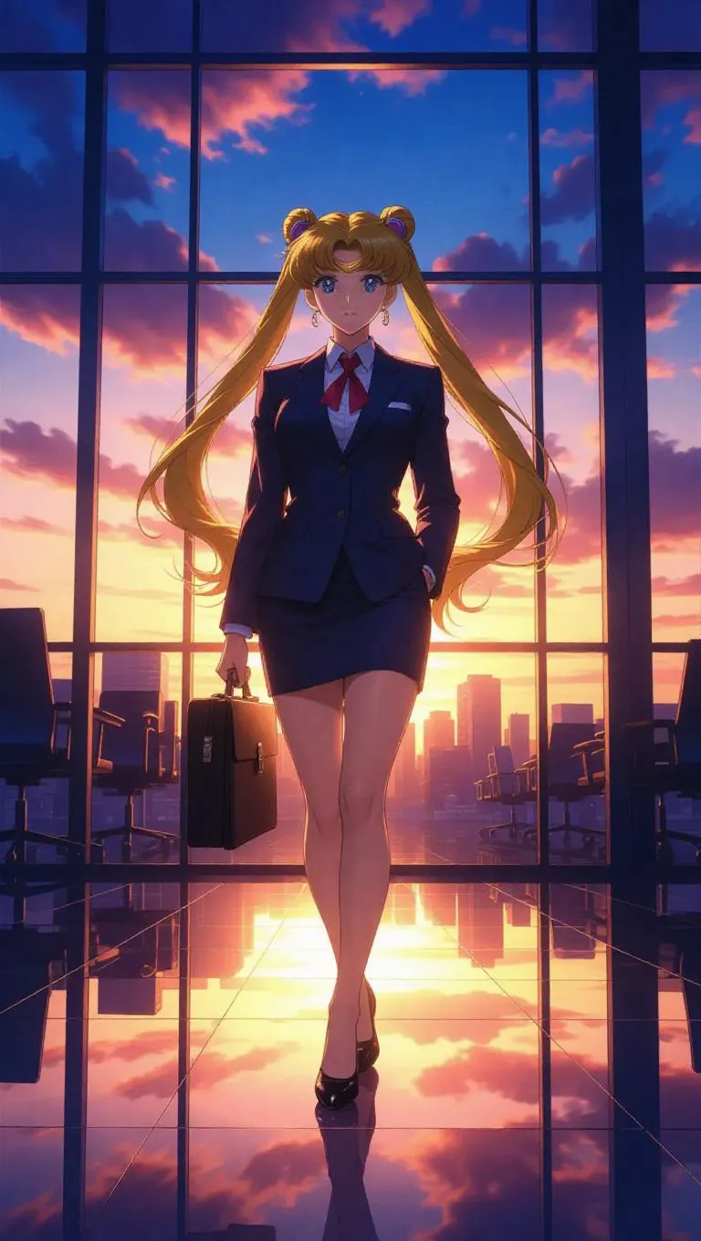 Sailor Moon, clad in a stylish business suit with a briefcase, confidently walks through a modern office building during sunset. The glass windows reflect the warm colors of the sky, symbolizing her ambition and success. The atmosphere is one of determination and professional elegance. Style: Realistic with a touch of manga influence.