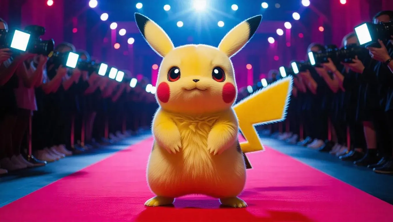 Pikachu, dressed in a glamorous film star outfit, stands tall on a red carpet. Its cheeks glow with electricity, and its radiant eyes reflect the glitzy, high-energy atmosphere. Flashing cameras pop around it, adding a bustling yet exciting ambiance. The venue is illuminated with bright lights, creating a star-studded glow that enhances the scene's allure. The style is a blend of realism and anime, capturing Pikachu's dazzling stance and the vibrant energy of the environment.